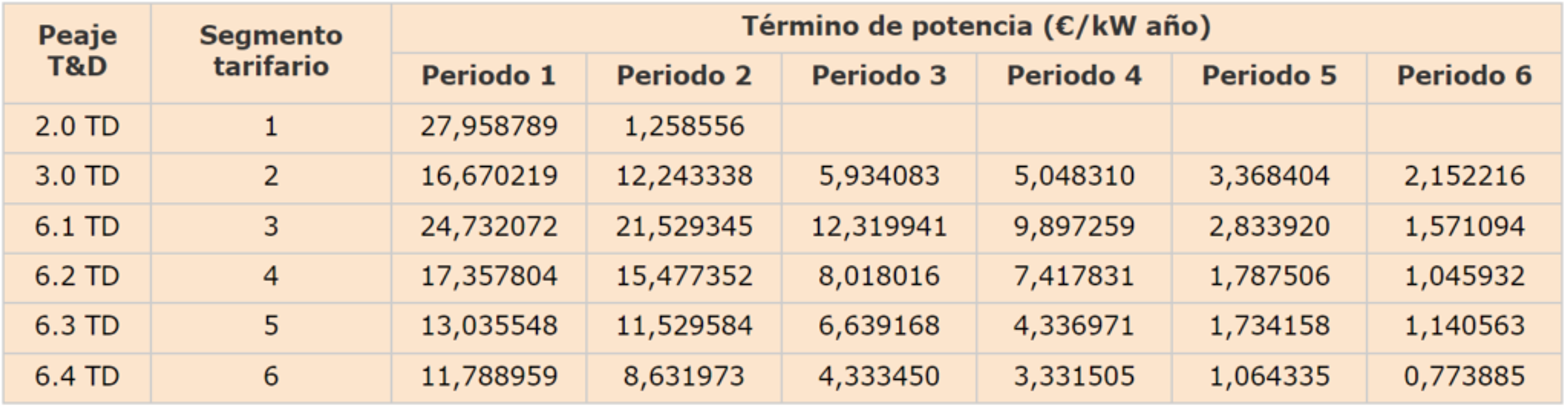 Los precios aplicables a los distintos segmentos en término de potencia a partir del 1 de enero de 2022 serán los siguientes: