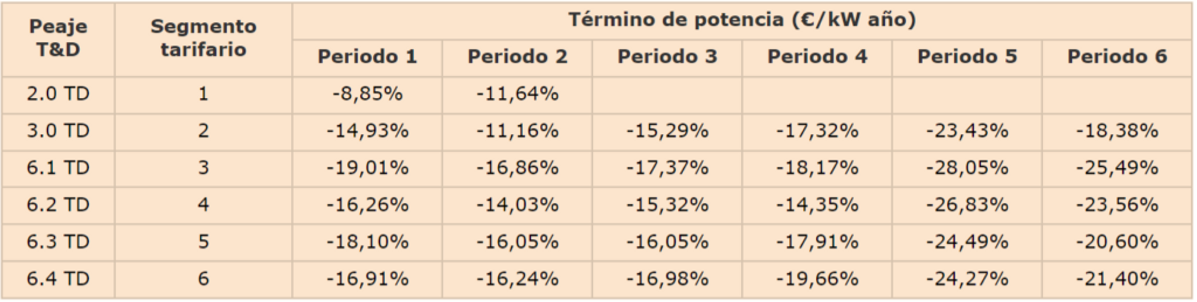 - Término de potencia (peajes + cargos): los costes del término de potencia serán sustancialmente inferiores respecto los de 2021. Según el tipo de tarifa que tenga cada consumidor, las reducciones de coste serán distintas: