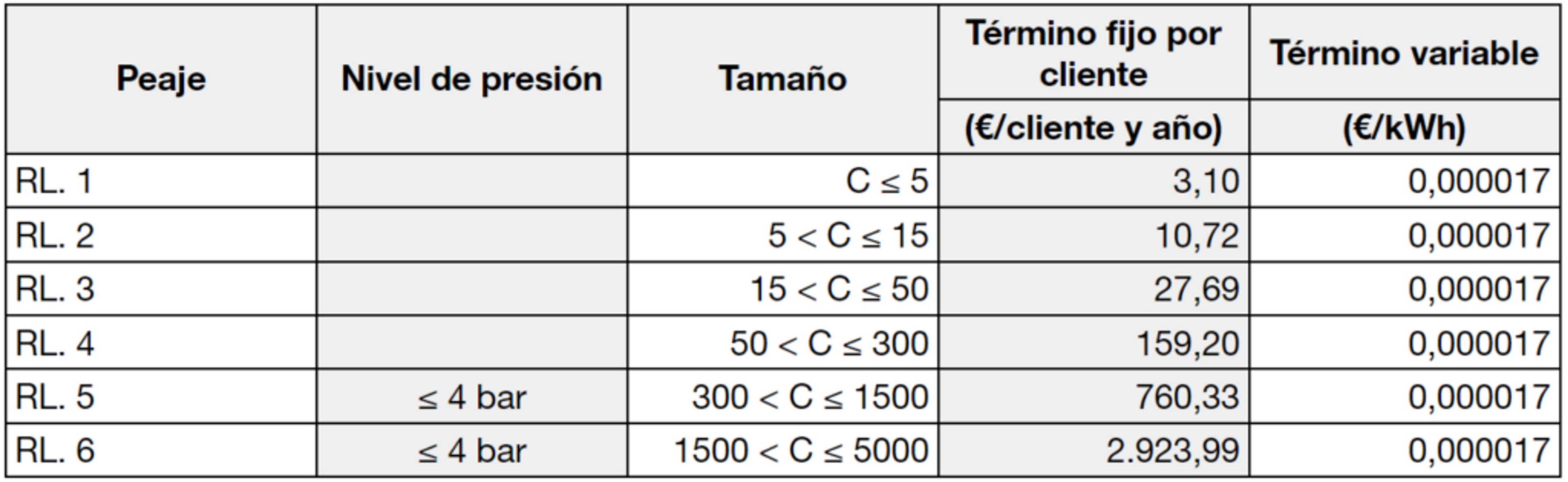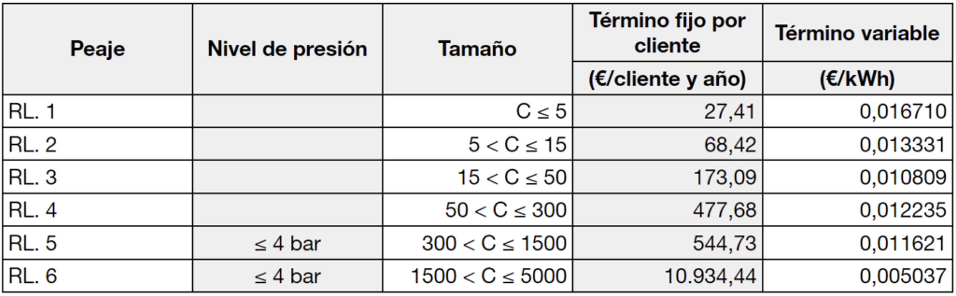 Los nuevos peajes de salida de transporte constan de un término fijo por capacidad o por cliente y un término variable por volumen de consumo, y serán los siguientes: