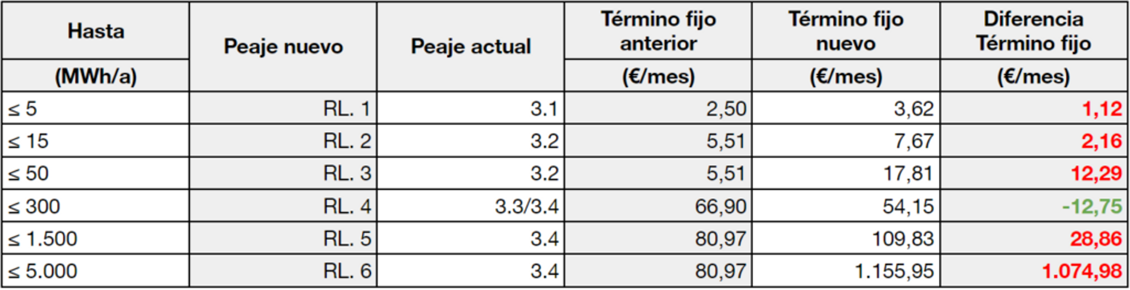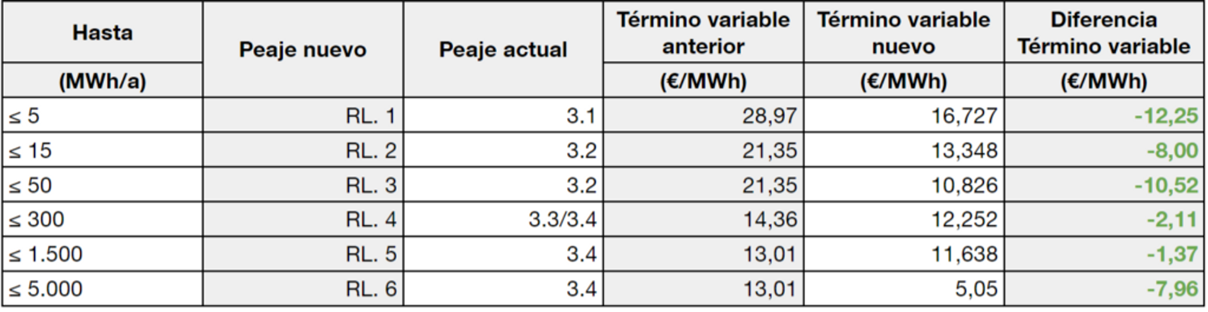 Por otro lado, y a pesar de no hacer mención en el artículo, algunas tarifas 2.2 actuales se verán beneficiadas, concretamente las que tengan un consumo inferior a los 1.500.000 kWh/año, y pertenecerán al grupo de las RLTA 5, mientras que las que tengan un consumo entre 1.500.000 y 5.000.000 kWh/año, se verán claramente perjudicadas, al formar parte del grupo tarifario RLTA. 6.