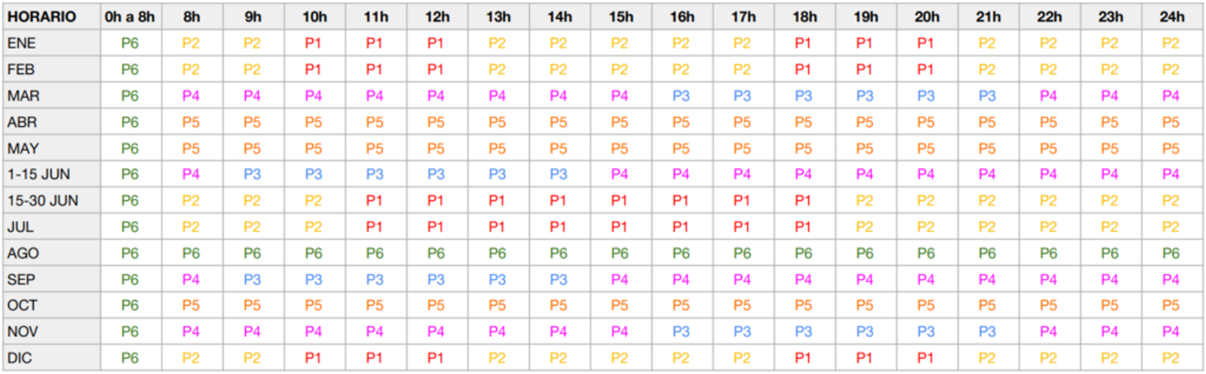 - Período Valle (P3): de 0h a 8h en (verano e invierno), 0h a 18h (fines de semana y festivos).