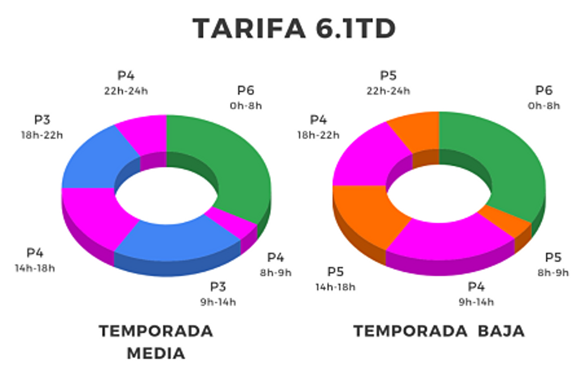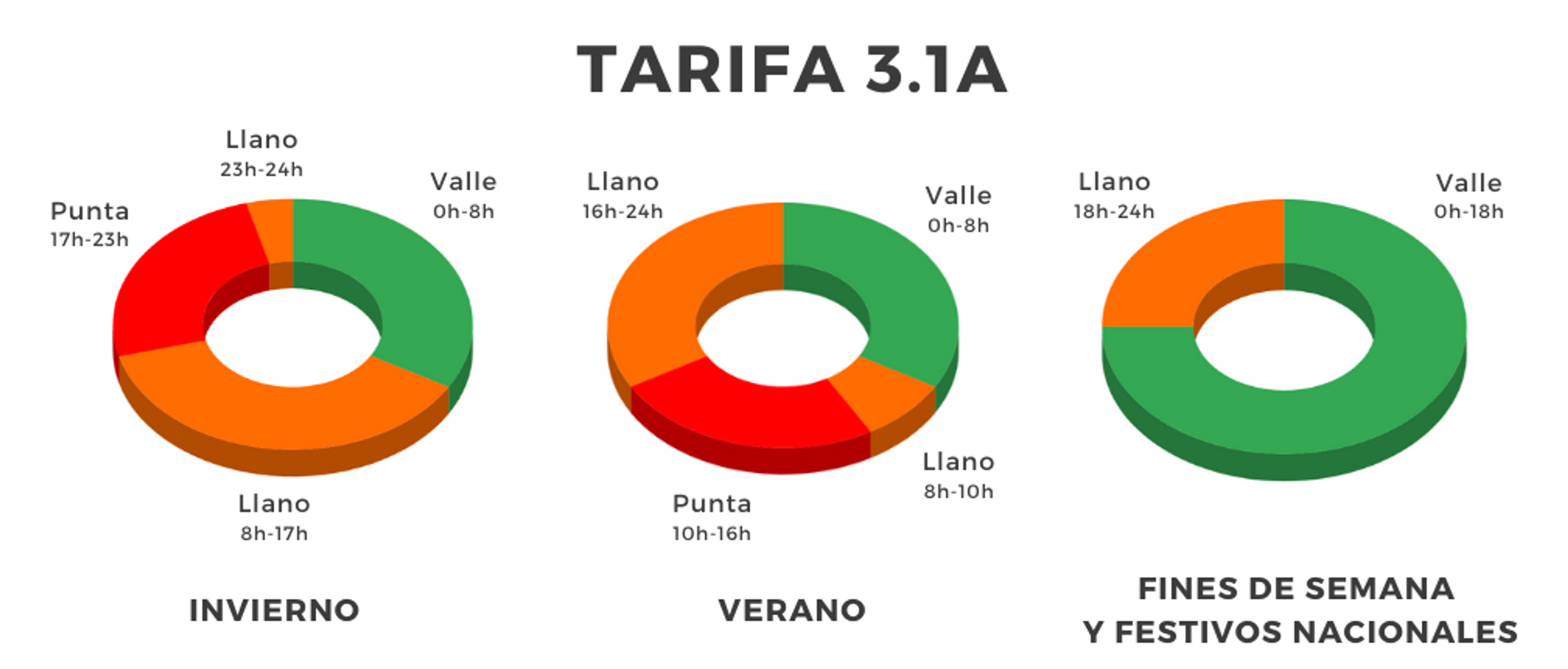 - Período Llano (P2): de 8h a 10h y 16h a 24h en (verano), de 8h a 17h y 23h a 24h en (invierno), de 18h a 24h (fines de semana y festivos).